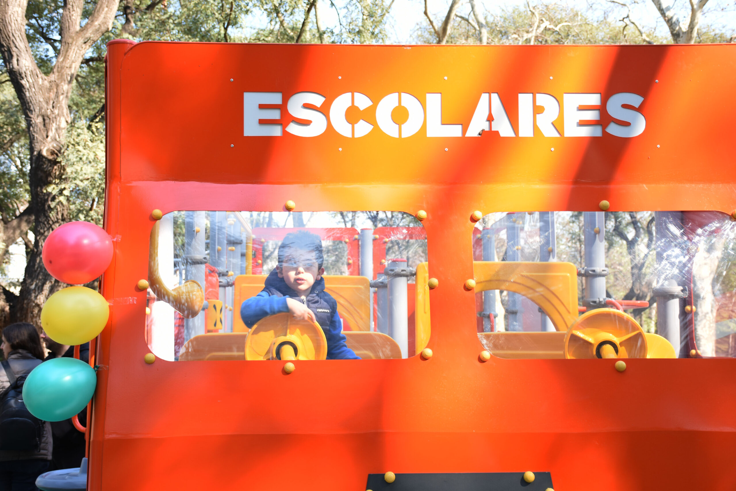 Tren, bus escolar y circuitos de educación vial en Plaza Haroldo Conti