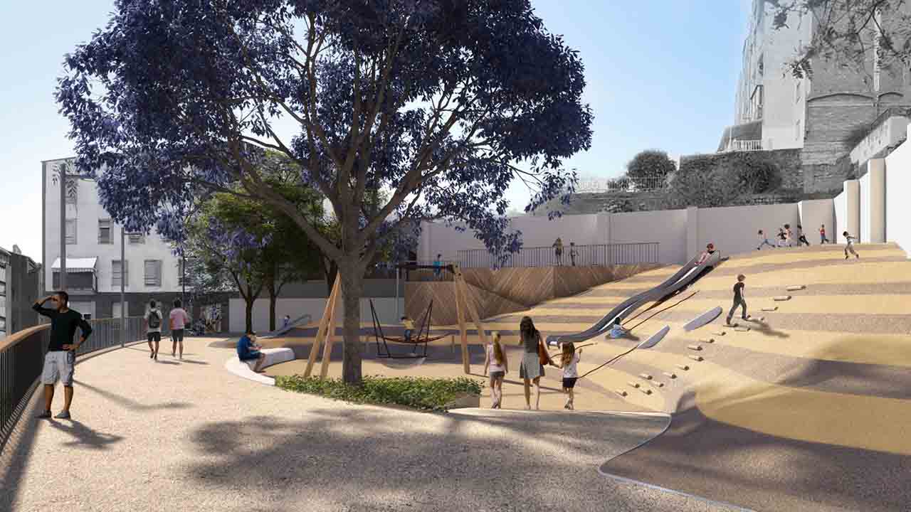 La nueva área de juegos se instalará en una zona del parque que será modificada topográficamente para lograr un espacio más amplio y accesible. Para ello, se nivelará parte del talud actual y se eliminará el último tramo de escaleras en el acceso desde la calle Ramon Rocafull, lo que mejorará la entrada al jardín.